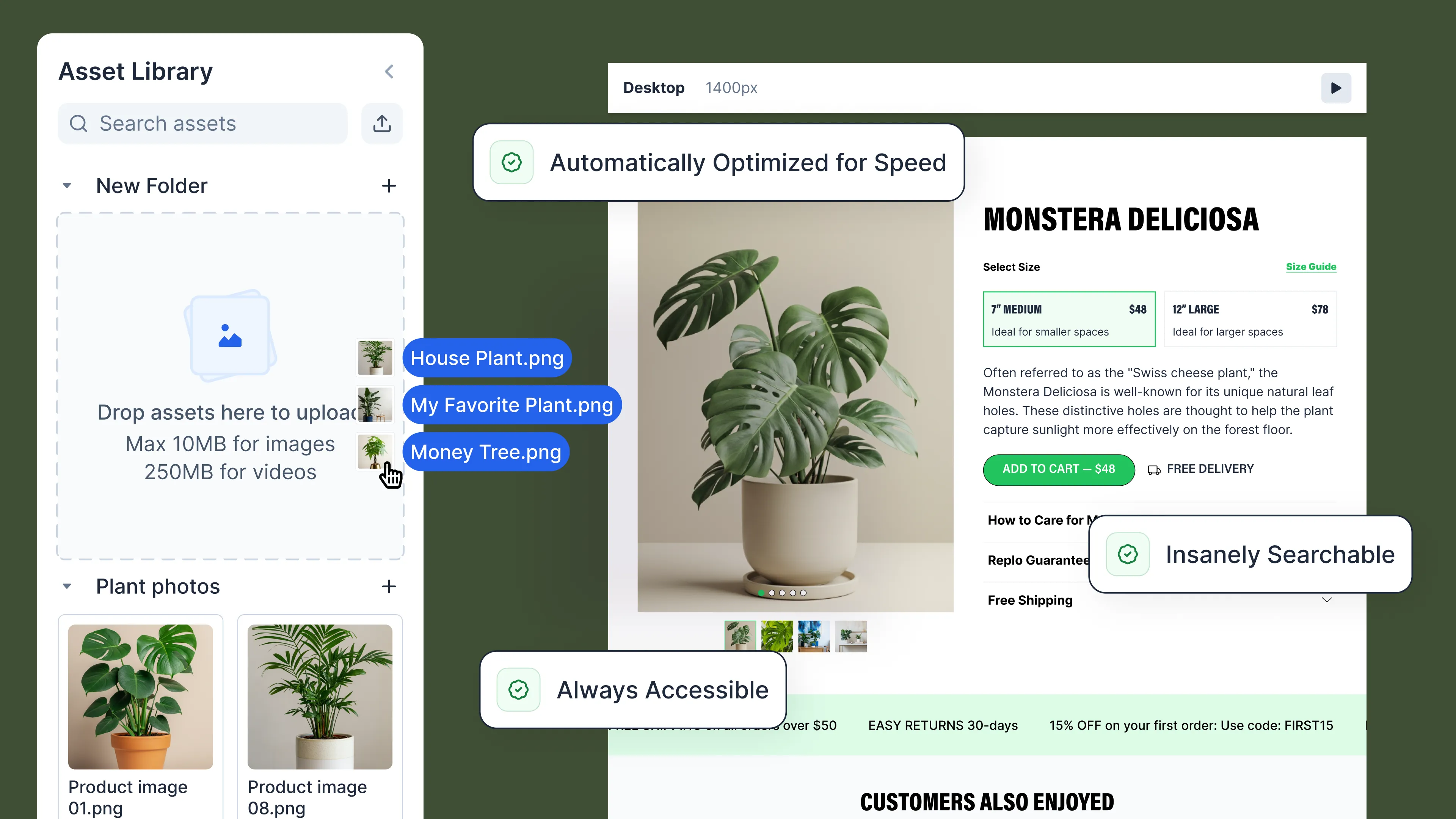 1. Faster Page Speeds Replo automatically compresses, resizes, and converts images to WEBP while serving from a global network of over 300+ cities — faster load times, always.