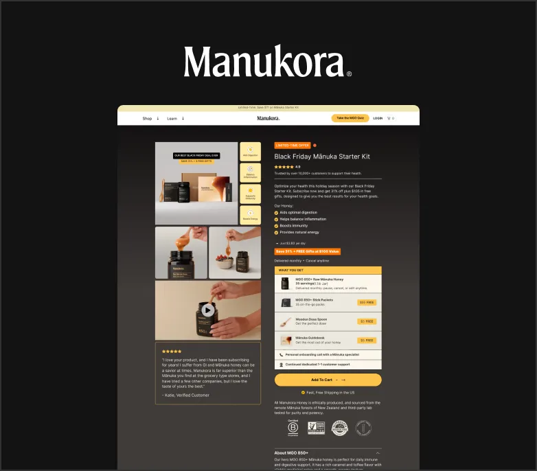 Emphasis on a Black Friday exclusive bundle deal, with extensive social proof from certifications and high ratings, add to the attraction of the product’s health-based benefits.