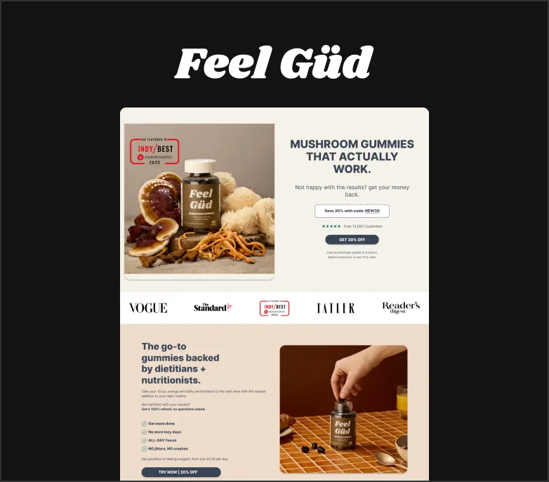 At Bottomless, our landing pages serve one clear purpose: to get your customers to take out their wallets. We follow a customer-centric process that combines meticulous research, persuasive copywriting, and cutting-edge design to ensure we answer every objection and give the customer everything they need to make a purchase. By staying laser-focused on this goal, our pages decrease CPA, boost conversion rates, and ultimately elevate ROAS. Our complete landing page solution is perfect for any e-commerce brand looking to increase its return on ad spend.