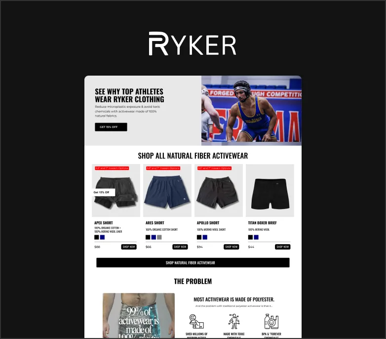 Social proof is placed front and center on this page; product education about “the problem” that Ryker is trying to solve further adds to the brand’s value proposition.