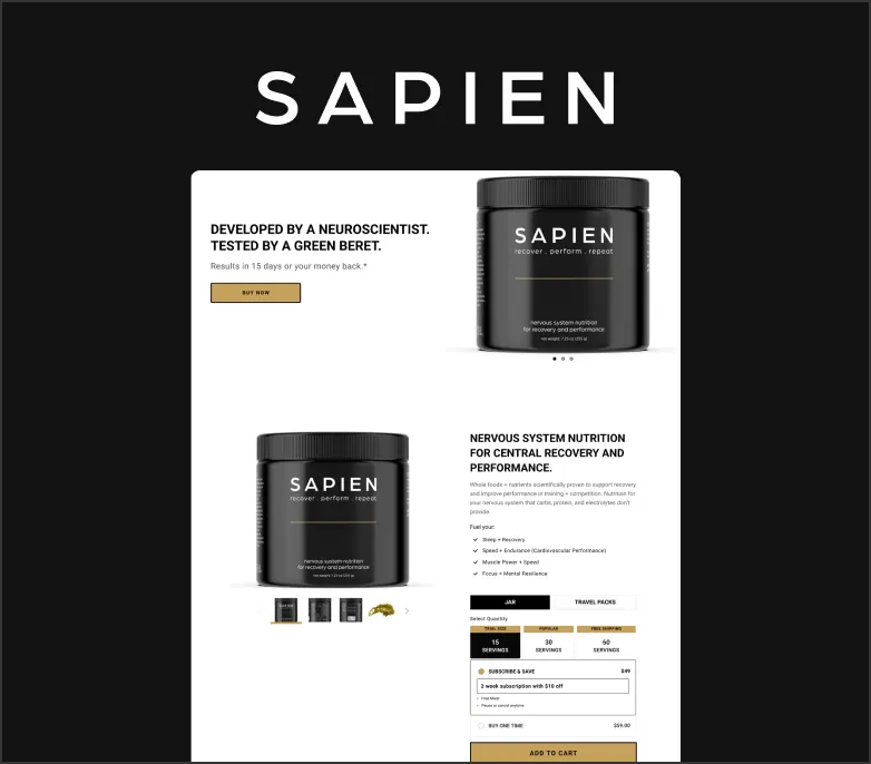 Clean product buy box design, paired with a unique focus on science-backed benefits. The hero text adds further credibility and authority to the product.