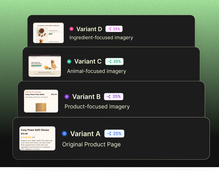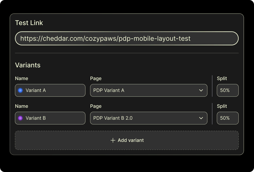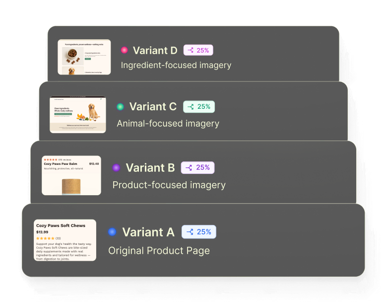 Build variants, split traffic, and iterate on your winners. No more juggling a bloated stack or resetting ad campaigns.