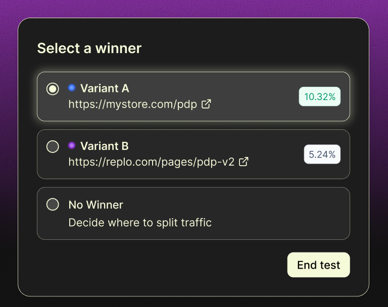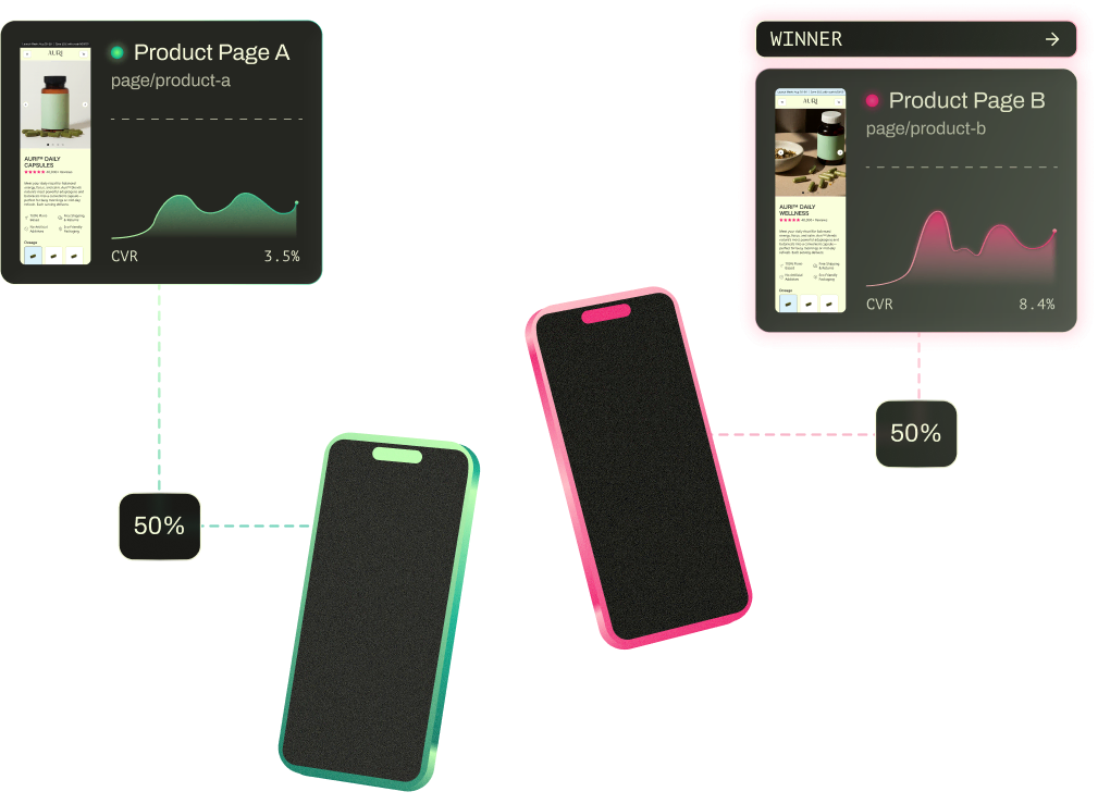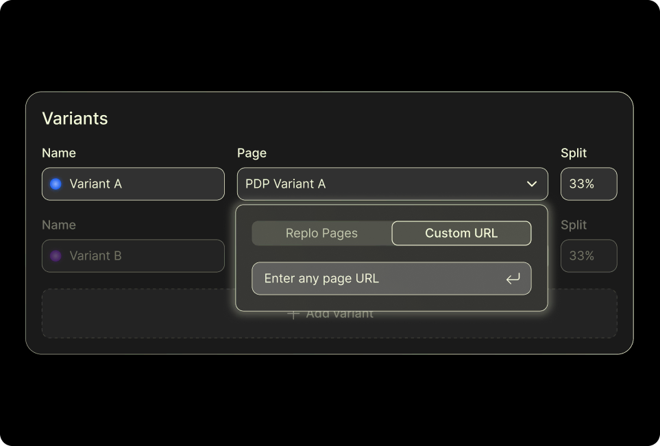 Run experiments between any URLs... your Shopify theme, existing landing pages, or Replo pages. Split traffic to anything.