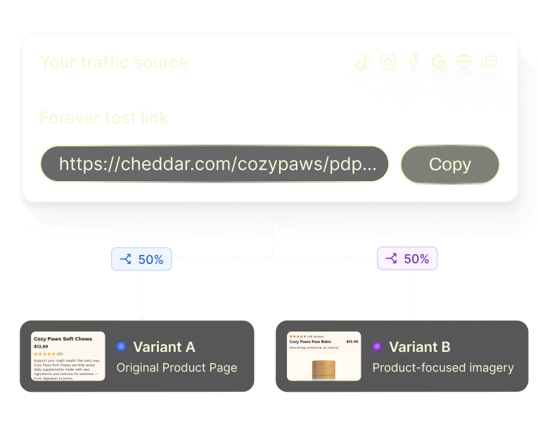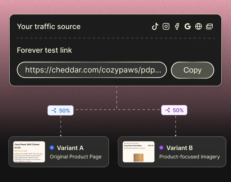 Set your traffic split, grab your forever link, and send traffic from ads, email, or anywhere else.