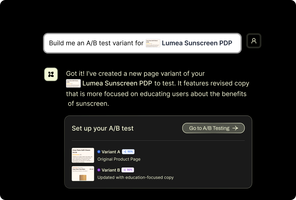 The fastest testing workflow in ecommerce. Build a variant on Monday morning, launch the test by lunch, read results by Friday.
