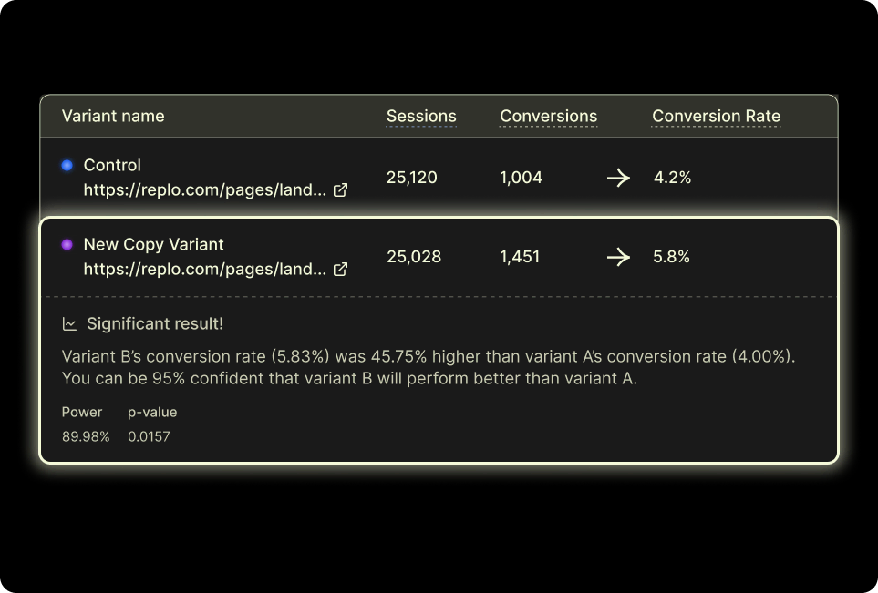Replo calculates statistical significance automatically. We'll tell you when your results are conclusive—so you're not calling winners too early or waiting too long.